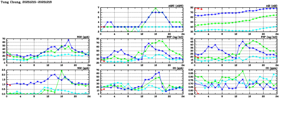 | Air Quality Data Time Series in Tung Chung (2025/12/18) | ( Line colors: Day -3 Day -2 Day -1 Current day ) | 2D Map Current AQHI |