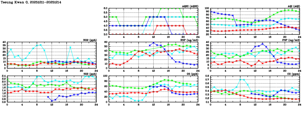 | Air Quality Data Time Series in Tseung Kwan O (2025/12/14) | ( Line colors: Day -3 Day -2 Day -1 Current day ) | 2D Map Current AQHI |