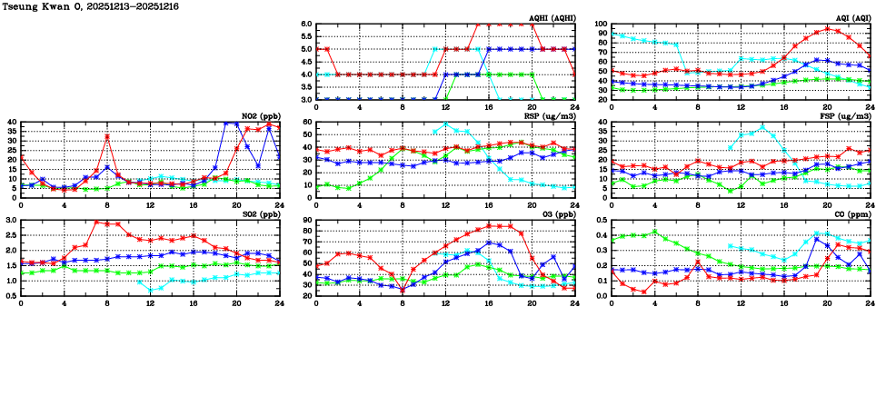 | Air Quality Data Time Series in Tseung Kwan O (2025/12/16) | ( Line colors: Day -3 Day -2 Day -1 Current day ) | 2D Map Current AQHI |