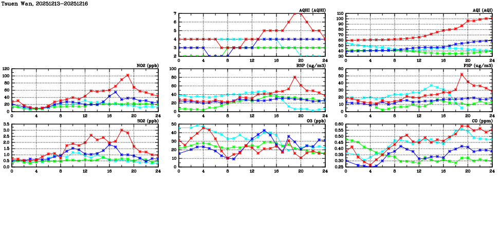 | Air Quality Data Time Series in Tsuen Wan (2025/12/16) | ( Line colors: Day -3 Day -2 Day -1 Current day ) | 2D Map Current AQHI |