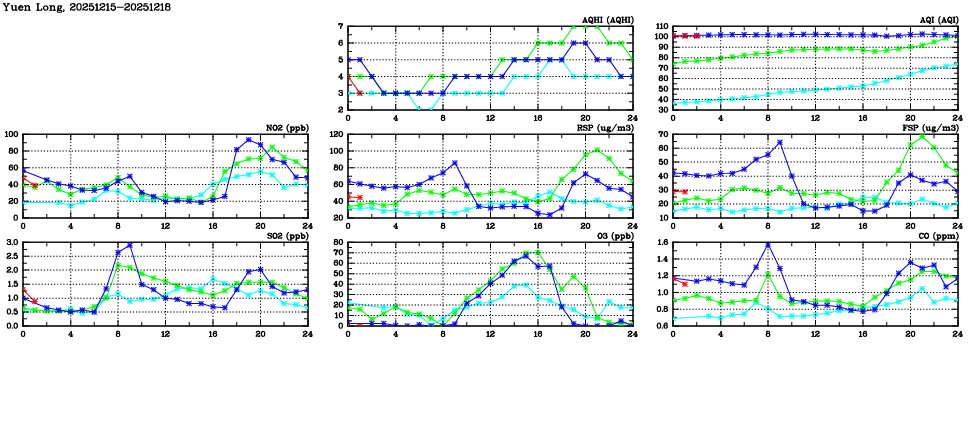 | Air Quality Data Time Series in Yuen Long (2025/12/18) | ( Line colors: Day -3 Day -2 Day -1 Current day ) | 2D Map Current AQHI |