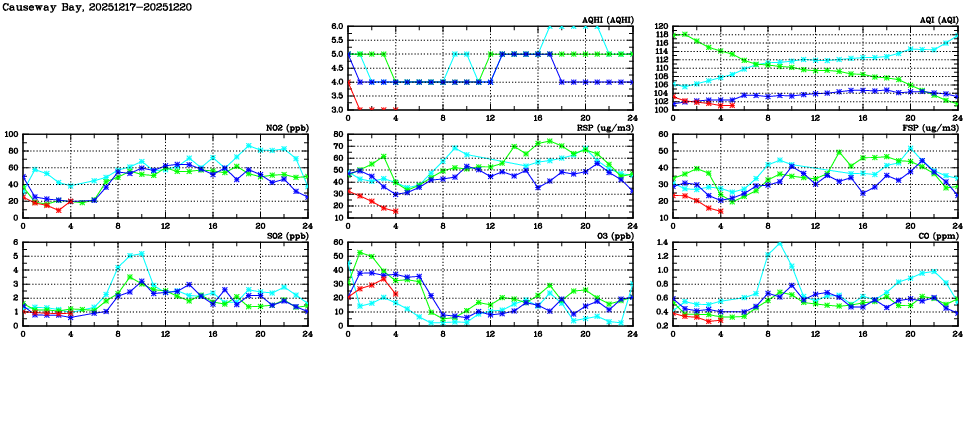 | Air Quality Data Time Series in Causeway Bay (2025/12/20) | ( Line colors: Day -3 Day -2 Day -1 Current day ) | 2D Map Current AQHI |