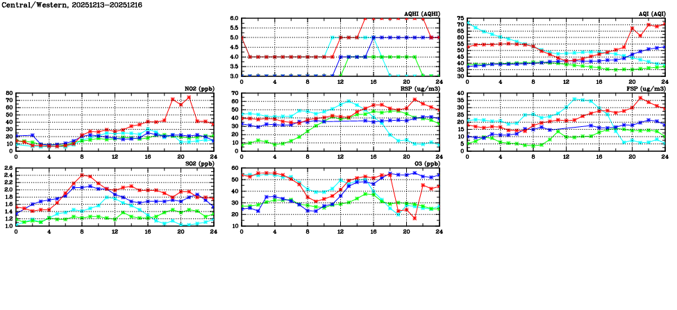 | Air Quality Data Time Series in Central/Western (2025/12/16) | ( Line colors: Day -3 Day -2 Day -1 Current day ) | 2D Map Current AQHI |