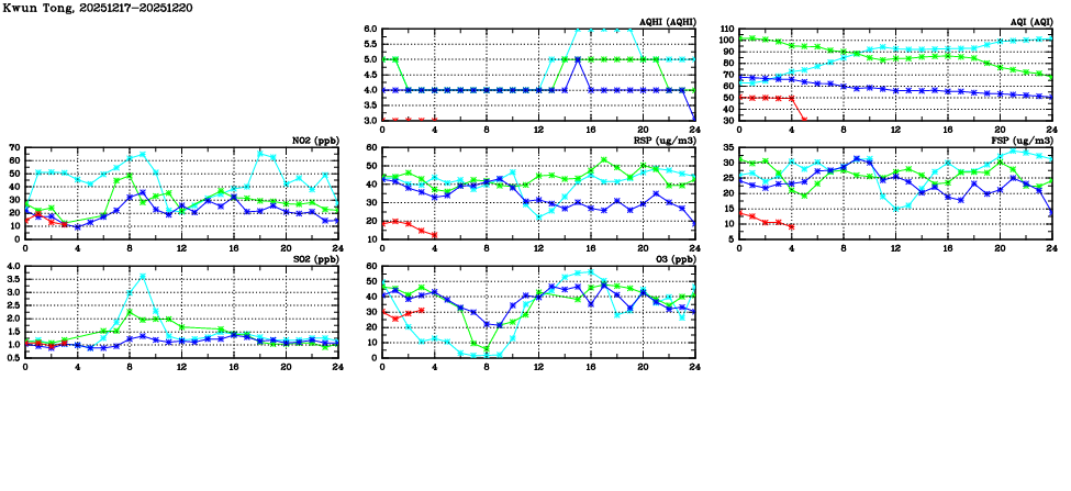 | Air Quality Data Time Series in Kwun Tong (2025/12/20) | ( Line colors: Day -3 Day -2 Day -1 Current day ) | 2D Map Current AQHI |