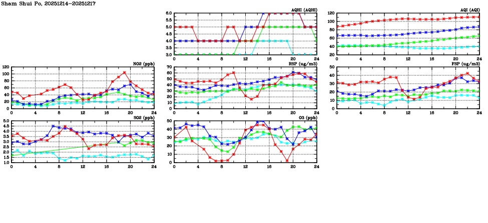 | Air Quality Data Time Series in Sham Shui Po (2025/12/17) | ( Line colors: Day -3 Day -2 Day -1 Current day ) | 2D Map Current AQHI |