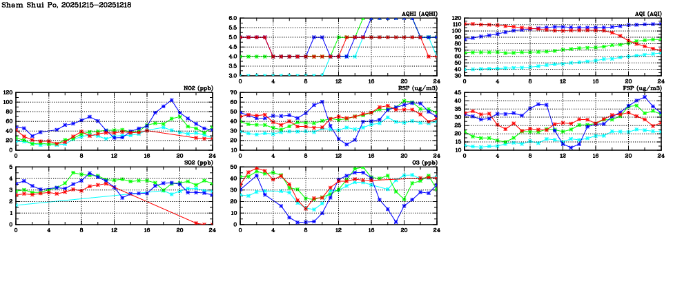| Air Quality Data Time Series in Sham Shui Po (2025/12/18) | ( Line colors: Day -3 Day -2 Day -1 Current day ) | 2D Map Current AQHI |