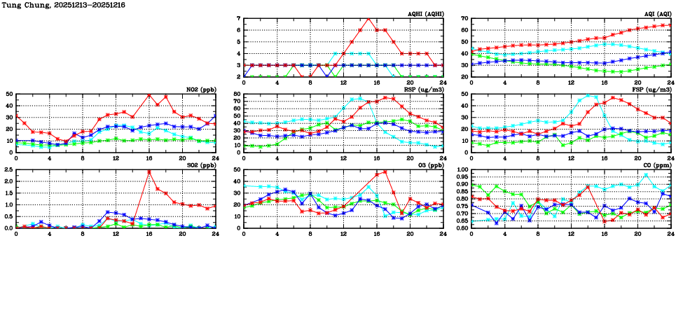 | Air Quality Data Time Series in Tung Chung (2025/12/16) | ( Line colors: Day -3 Day -2 Day -1 Current day ) | 2D Map Current AQHI |