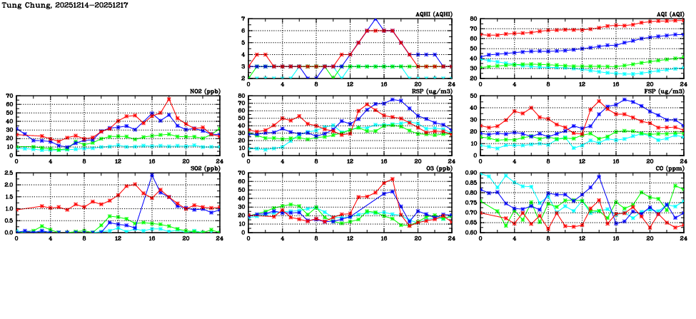 | Air Quality Data Time Series in Tung Chung (2025/12/17) | ( Line colors: Day -3 Day -2 Day -1 Current day ) | 2D Map Current AQHI |
