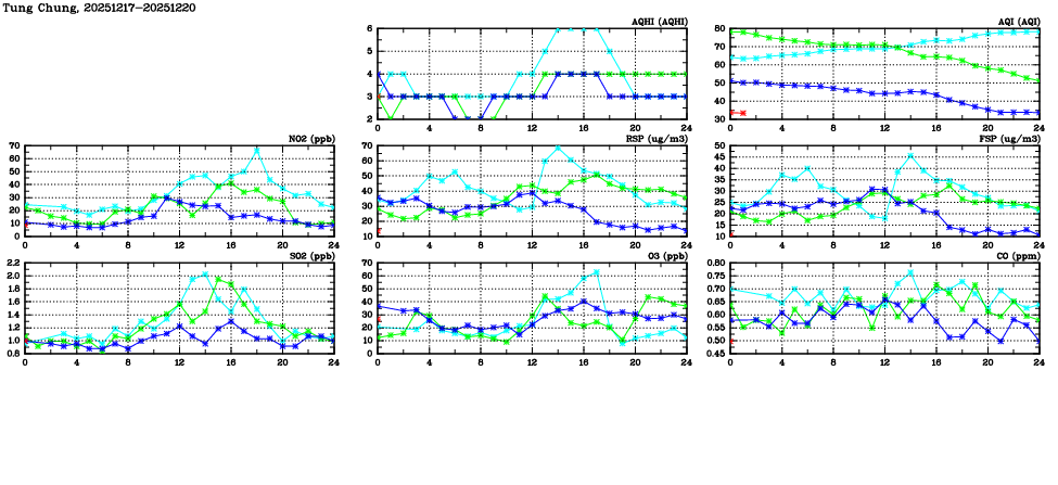 | Air Quality Data Time Series in Tung Chung (2025/12/20) | ( Line colors: Day -3 Day -2 Day -1 Current day ) | 2D Map Current AQHI |