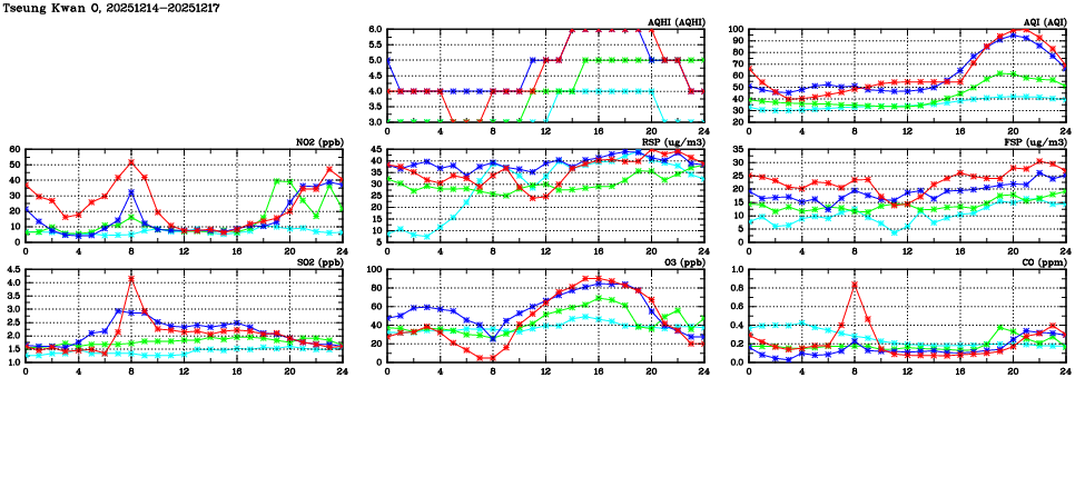 | Air Quality Data Time Series in Tseung Kwan O (2025/12/17) | ( Line colors: Day -3 Day -2 Day -1 Current day ) | 2D Map Current AQHI |