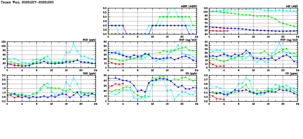| Air Quality Data Time Series in Tsuen Wan (2025/12/20) | ( Line colors: Day -3 Day -2 Day -1 Current day ) | 2D Map Current AQHI |
