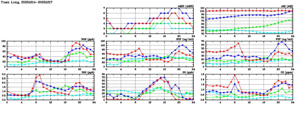 | Air Quality Data Time Series in Yuen Long (2025/12/17) | ( Line colors: Day -3 Day -2 Day -1 Current day ) | 2D Map Current AQHI |