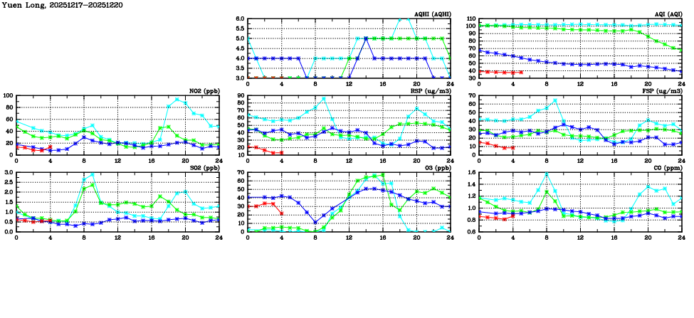 | Air Quality Data Time Series in Yuen Long (2025/12/20) | ( Line colors: Day -3 Day -2 Day -1 Current day ) | 2D Map Current AQHI |