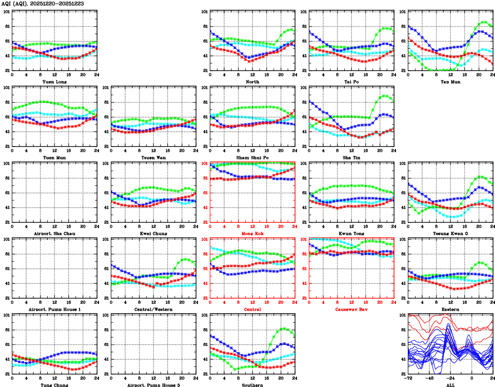 | Air Quality Data Time Series for AQI (2025/12/23) | ( Line colors: Day -3 Day -2 Day -1 Current day ) | 2D Map Current AQHI |