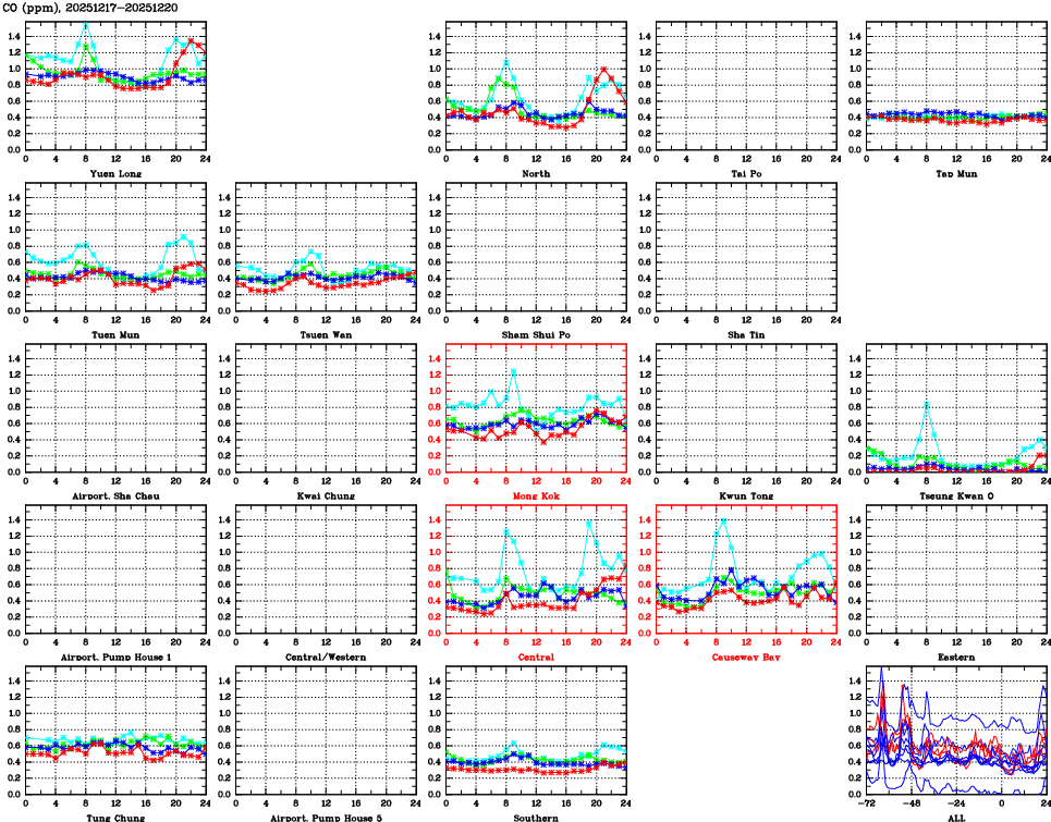 | Air Quality Data Time Series for CO (2025/12/20) | ( Line colors: Day -3 Day -2 Day -1 Current day ) | 2D Map Current AQHI |