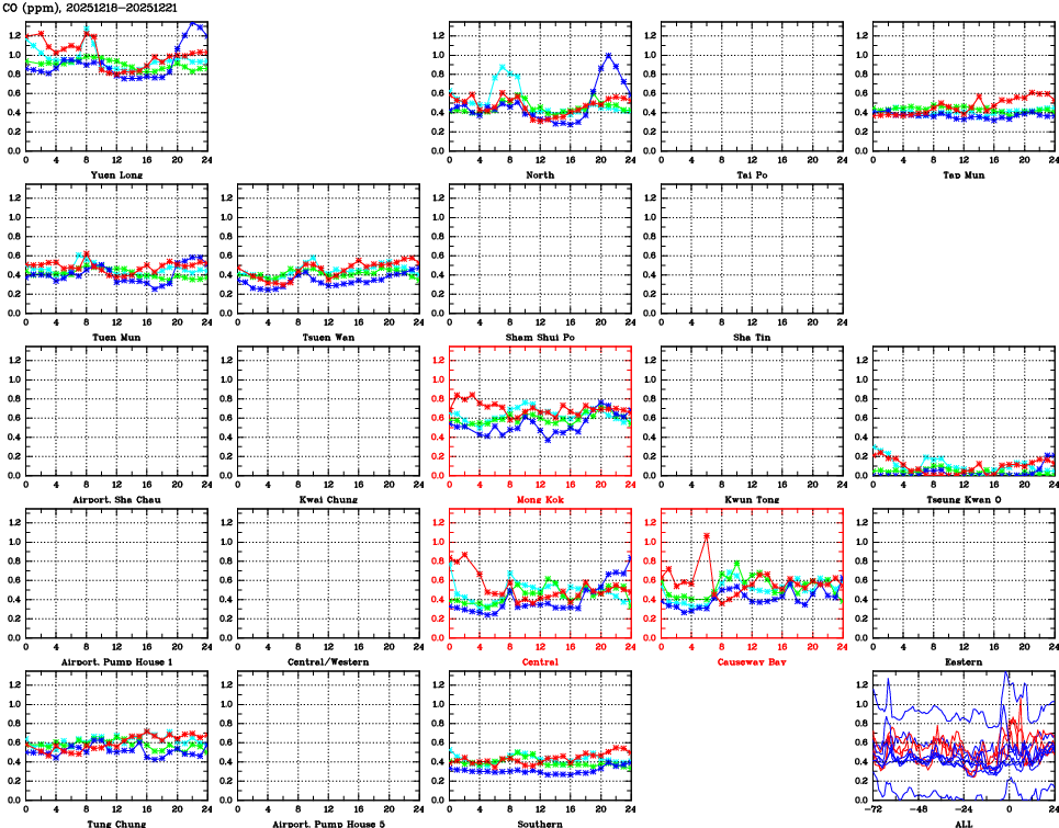 | Air Quality Data Time Series for CO (2025/12/21) | ( Line colors: Day -3 Day -2 Day -1 Current day ) | 2D Map Current AQHI |