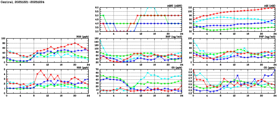 | Air Quality Data Time Series in Central (2025/12/24) | ( Line colors: Day -3 Day -2 Day -1 Current day ) | 2D Map Current AQHI |