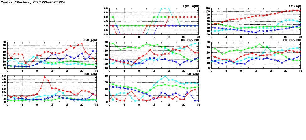 | Air Quality Data Time Series in Central/Western (2025/12/24) | ( Line colors: Day -3 Day -2 Day -1 Current day ) | 2D Map Current AQHI |