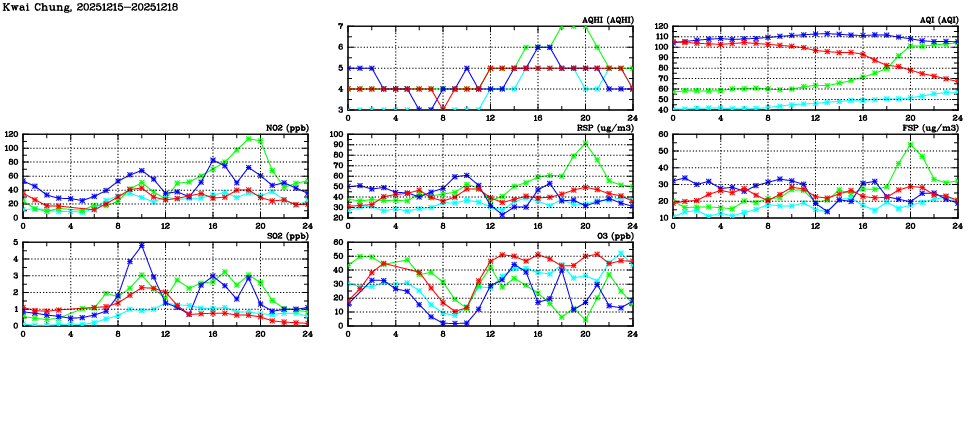 | Air Quality Data Time Series in Kwai Chung (2025/12/18) | ( Line colors: Day -3 Day -2 Day -1 Current day ) | 2D Map Current AQHI |