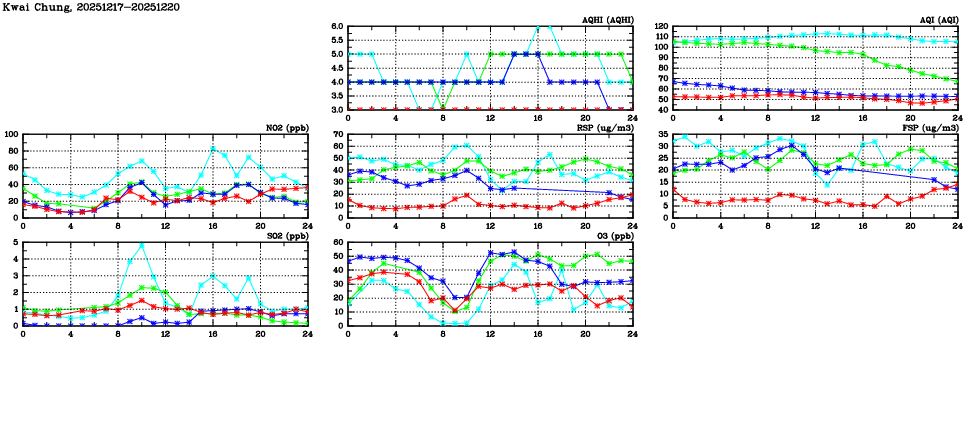 | Air Quality Data Time Series in Kwai Chung (2025/12/20) | ( Line colors: Day -3 Day -2 Day -1 Current day ) | 2D Map Current AQHI |