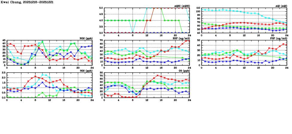 | Air Quality Data Time Series in Kwai Chung (2025/12/21) | ( Line colors: Day -3 Day -2 Day -1 Current day ) | 2D Map Current AQHI |