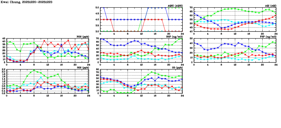 | Air Quality Data Time Series in Kwai Chung (2025/12/23) | ( Line colors: Day -3 Day -2 Day -1 Current day ) | 2D Map Current AQHI |