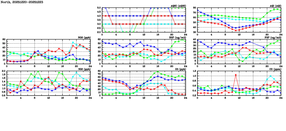 | Air Quality Data Time Series in North (2025/12/23) | ( Line colors: Day -3 Day -2 Day -1 Current day ) | 2D Map Current AQHI |