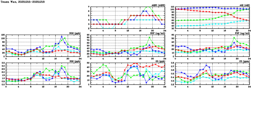 | Air Quality Data Time Series in Tsuen Wan (2025/12/18) | ( Line colors: Day -3 Day -2 Day -1 Current day ) | 2D Map Current AQHI |