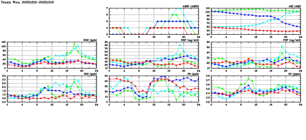 | Air Quality Data Time Series in Tsuen Wan (2025/12/19) | ( Line colors: Day -3 Day -2 Day -1 Current day ) | 2D Map Current AQHI |