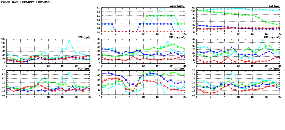 | Air Quality Data Time Series in Tsuen Wan (2025/12/20) | ( Line colors: Day -3 Day -2 Day -1 Current day ) | 2D Map Current AQHI |