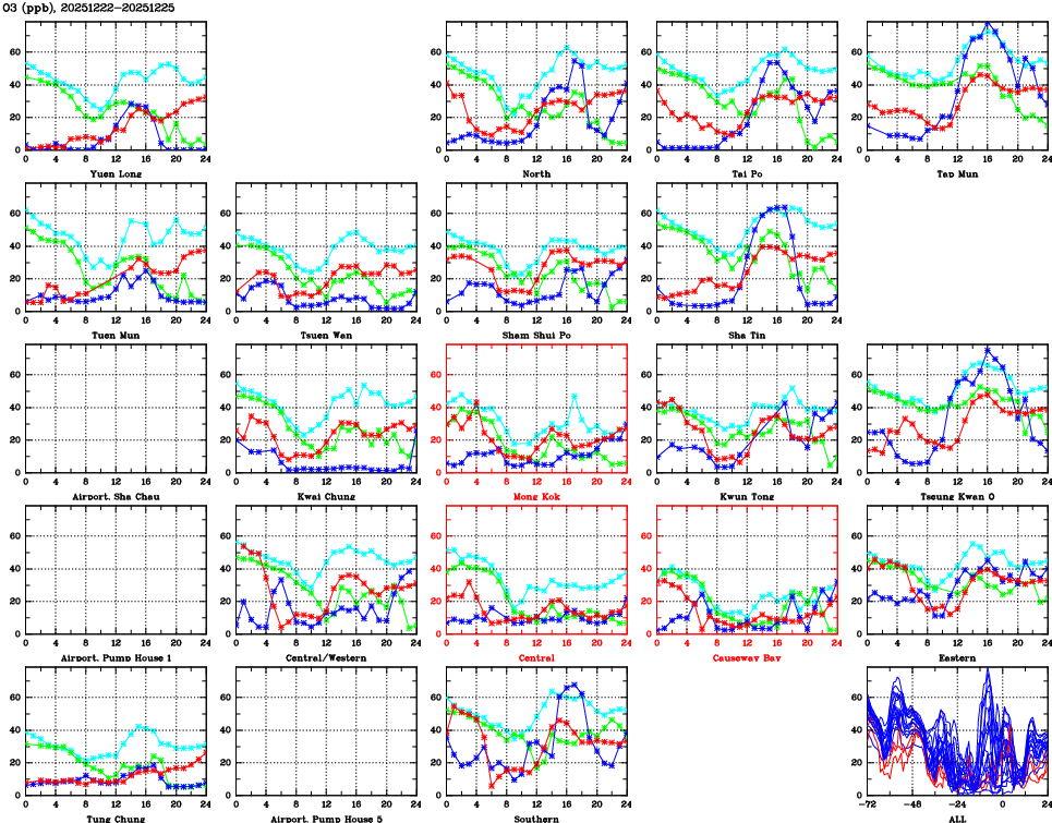 | Air Quality Data Time Series for O3 (2025/12/25) | ( Line colors: Day -3 Day -2 Day -1 Current day ) | 2D Map Current AQHI |