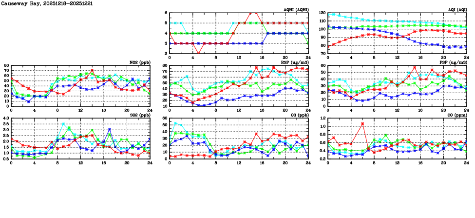 | Air Quality Data Time Series in Causeway Bay (2025/12/21) | ( Line colors: Day -3 Day -2 Day -1 Current day ) | 2D Map Current AQHI |