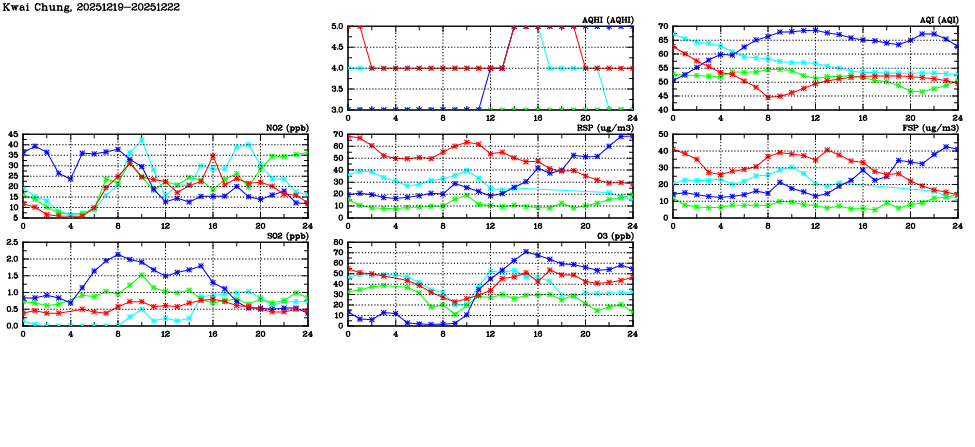 | Air Quality Data Time Series in Kwai Chung (2025/12/22) | ( Line colors: Day -3 Day -2 Day -1 Current day ) | 2D Map Current AQHI |