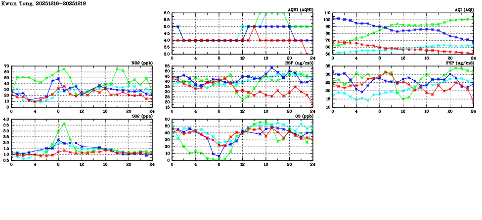 | Air Quality Data Time Series in Kwun Tong (2025/12/19) | ( Line colors: Day -3 Day -2 Day -1 Current day ) | 2D Map Current AQHI |