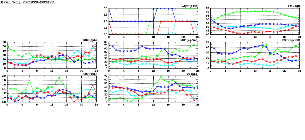 | Air Quality Data Time Series in Kwun Tong (2025/12/23) | ( Line colors: Day -3 Day -2 Day -1 Current day ) | 2D Map Current AQHI |