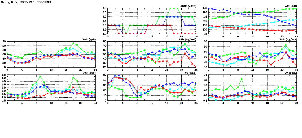 | Air Quality Data Time Series in Mong Kok (2025/12/19) | ( Line colors: Day -3 Day -2 Day -1 Current day ) | 2D Map Current AQHI |