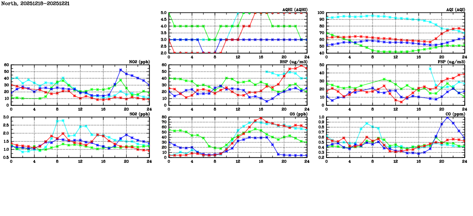 | Air Quality Data Time Series in North (2025/12/21) | ( Line colors: Day -3 Day -2 Day -1 Current day ) | 2D Map Current AQHI |