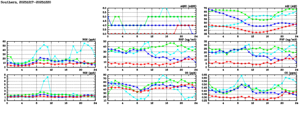 | Air Quality Data Time Series in Southern (2025/12/20) | ( Line colors: Day -3 Day -2 Day -1 Current day ) | 2D Map Current AQHI |