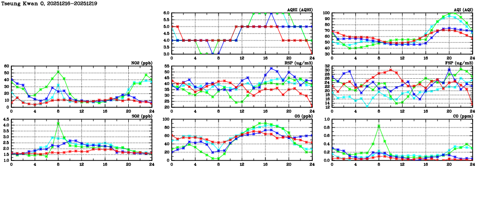 | Air Quality Data Time Series in Tseung Kwan O (2025/12/19) | ( Line colors: Day -3 Day -2 Day -1 Current day ) | 2D Map Current AQHI |
