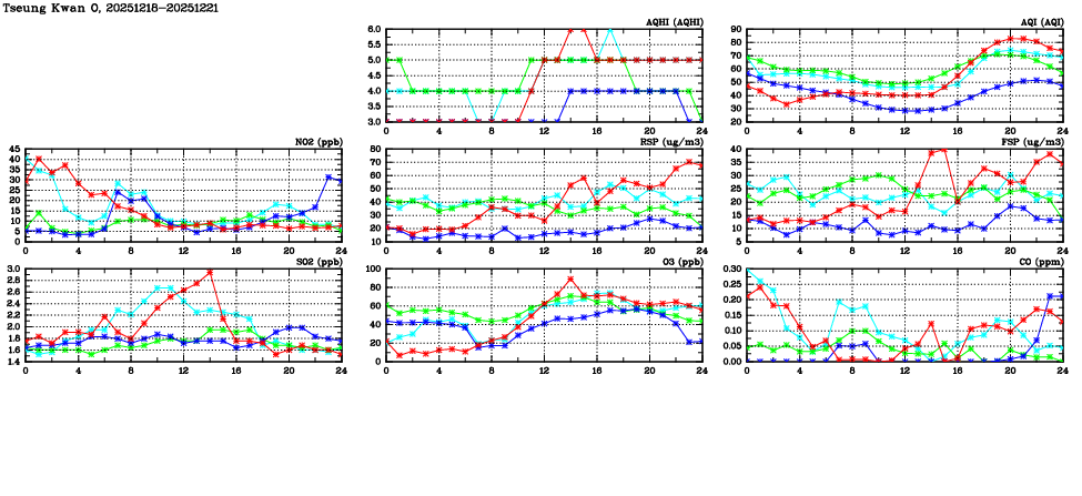 | Air Quality Data Time Series in Tseung Kwan O (2025/12/21) | ( Line colors: Day -3 Day -2 Day -1 Current day ) | 2D Map Current AQHI |