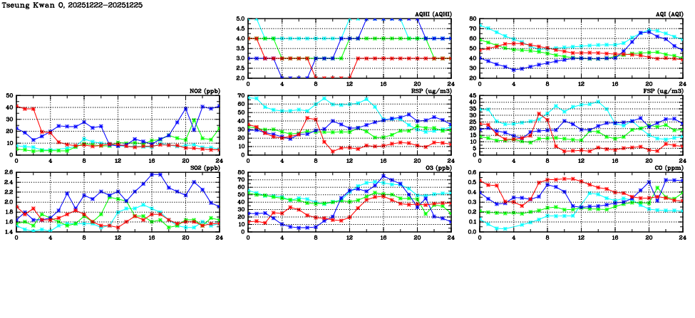 | Air Quality Data Time Series in Tseung Kwan O (2025/12/25) | ( Line colors: Day -3 Day -2 Day -1 Current day ) | 2D Map Current AQHI |