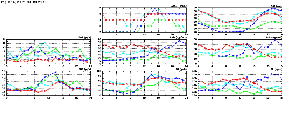 | Air Quality Data Time Series in Tap Mun (2025/12/22) | ( Line colors: Day -3 Day -2 Day -1 Current day ) | 2D Map Current AQHI |