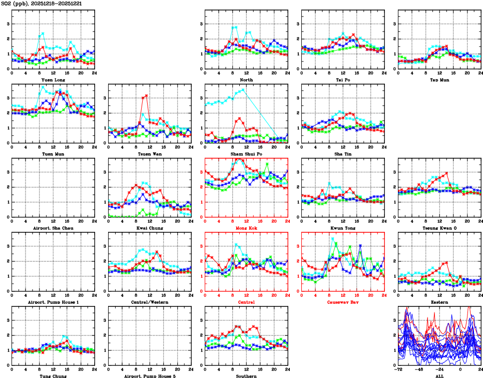 | Air Quality Data Time Series for SO2 (2025/12/21) | ( Line colors: Day -3 Day -2 Day -1 Current day ) | 2D Map Current AQHI |