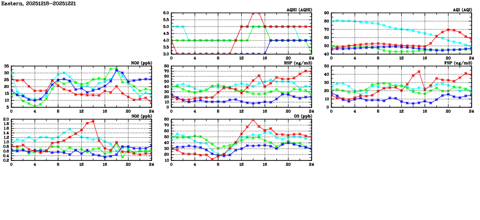 | Air Quality Data Time Series in Eastern (2025/12/21) | ( Line colors: Day -3 Day -2 Day -1 Current day ) | 2D Map Current AQHI |