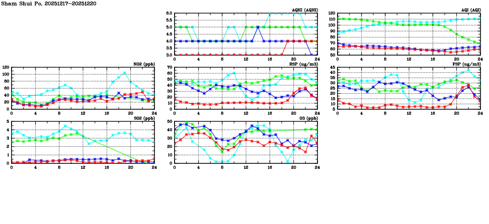 | Air Quality Data Time Series in Sham Shui Po (2025/12/20) | ( Line colors: Day -3 Day -2 Day -1 Current day ) | 2D Map Current AQHI |