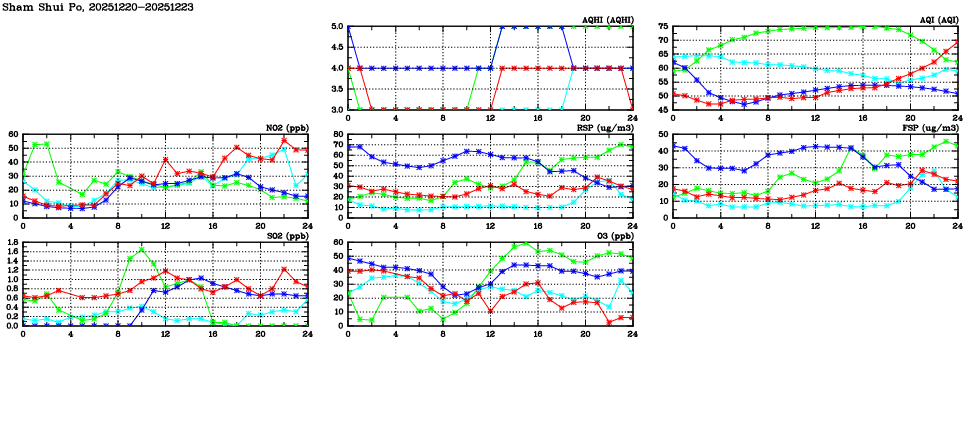 | Air Quality Data Time Series in Sham Shui Po (2025/12/23) | ( Line colors: Day -3 Day -2 Day -1 Current day ) | 2D Map Current AQHI |