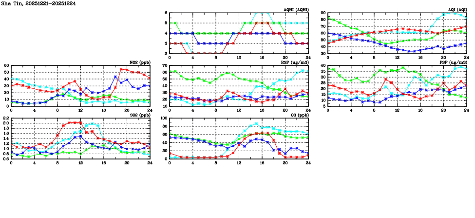 | Air Quality Data Time Series in Sha Tin (2025/12/24) | ( Line colors: Day -3 Day -2 Day -1 Current day ) | 2D Map Current AQHI |