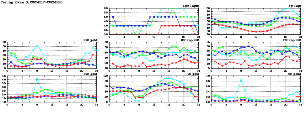| Air Quality Data Time Series in Tseung Kwan O (2025/12/20) | ( Line colors: Day -3 Day -2 Day -1 Current day ) | 2D Map Current AQHI |