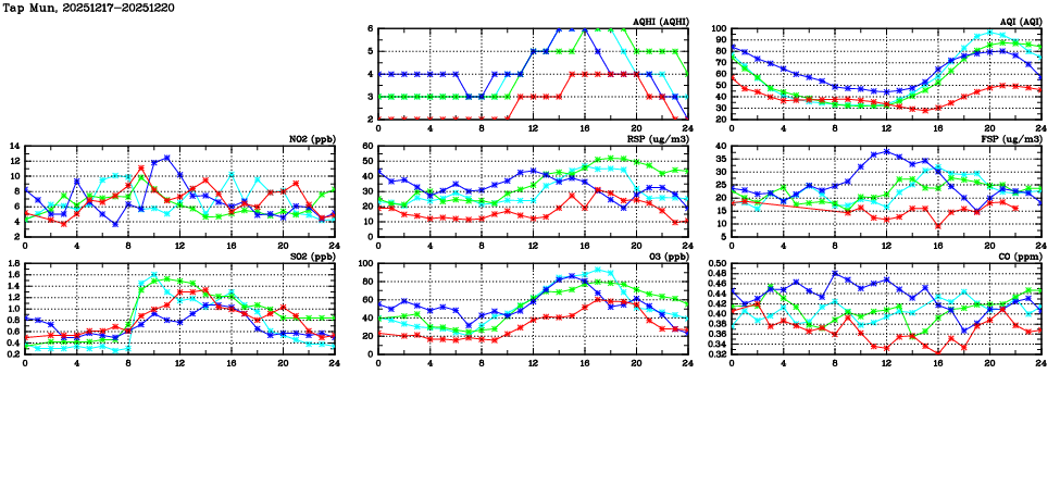 | Air Quality Data Time Series in Tap Mun (2025/12/20) | ( Line colors: Day -3 Day -2 Day -1 Current day ) | 2D Map Current AQHI |