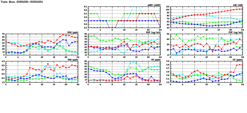 | Air Quality Data Time Series in Tuen Mun (2025/12/24) | ( Line colors: Day -3 Day -2 Day -1 Current day ) | 2D Map Current AQHI |